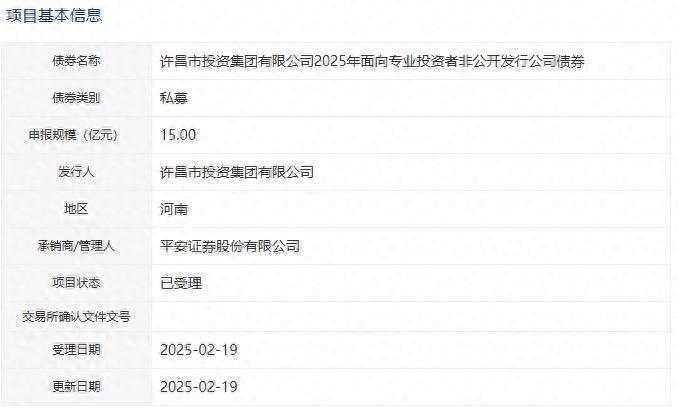 【大河财立方消息】2月20日,许昌市投资集团有限公司2025年面向专业投资者非公开发行公司债券获深交所受理。